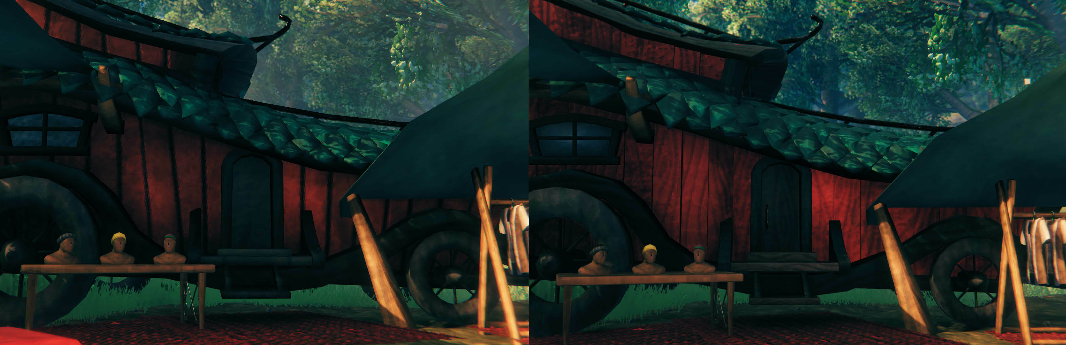 Aber nun zurück zum Videospiel! Natürlich beginnen wir, über die Ashlands hinauszublicken und in die Zukunft zu schauen, und wir arbeiten an etwas Kleinem, das im Herbst bei euch sein wird... Wir werden noch nicht alles verraten, was es beinhaltet, aber es wird einige Überarbeitungen und Korrekturen von Hildirs Waren und ihrem Lager beinhalten. Hier haben wir einen kleinen Vorher-Nachher-Vergleich für euch zur Vorschau: